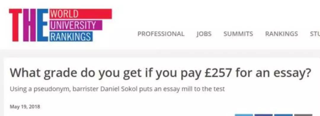 《泰晤士报》也派过记者暗访一家高分代写机构,要求写一篇本科生2000字论文,并采用“白金”服务,要求70分以上(一等学位)。对方收了257镑,而作文的质量最终经过大学教授评估,只能拿58分(二等二学位)。然而实际上,257镑在代写界算是良心价了。