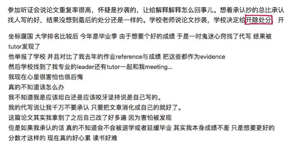 上网随便一查就能看到不少同学找代写险些被开除的例子,甚至有同学被开除后要求七天内必须出境。