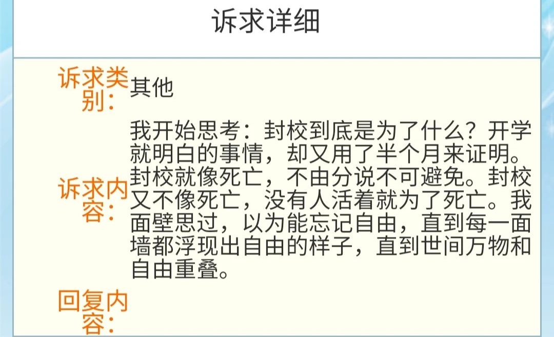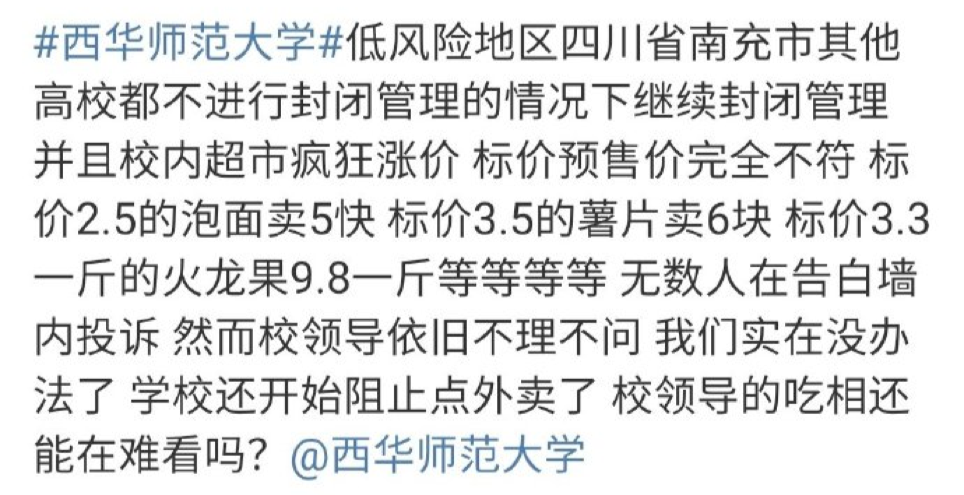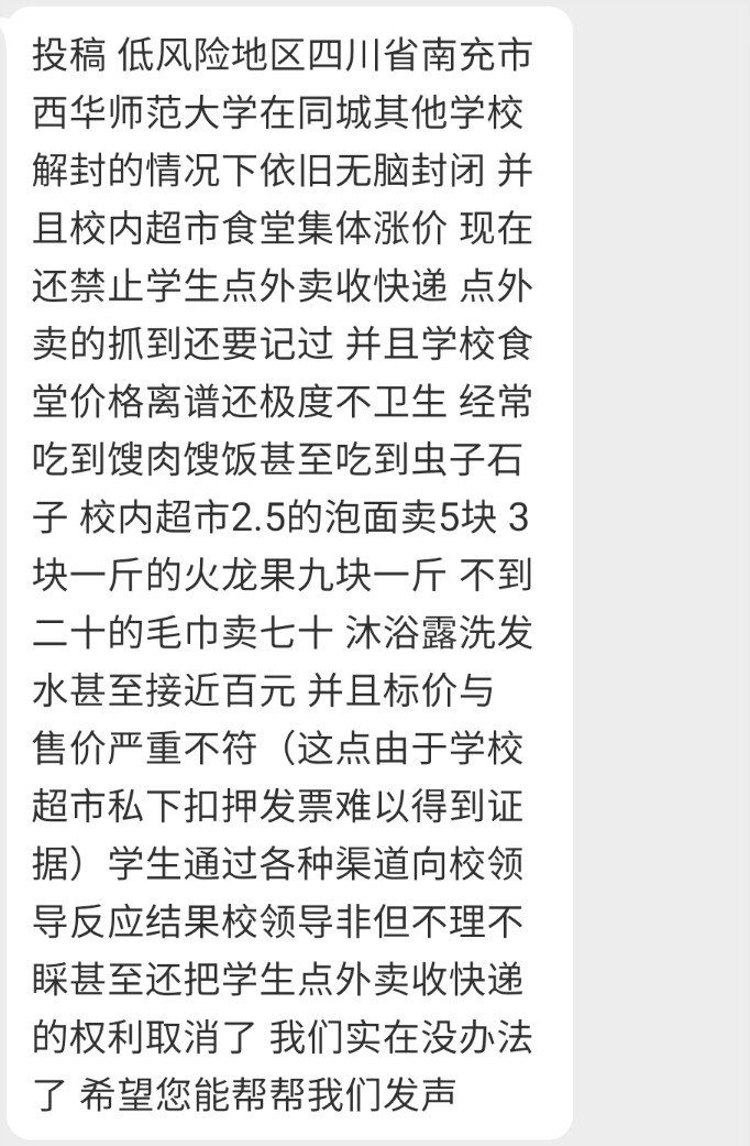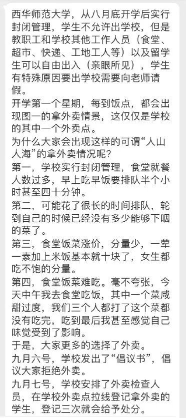 1、虽然学校实行封闭管理,但教职工和留学生可以随意外出;2、学校禁止学生叫外卖,但校园内里却物价上涨;3、不得不吃食堂的同学们几乎每日都能在食堂饭菜里看到异物;