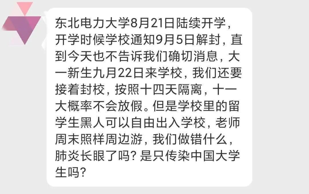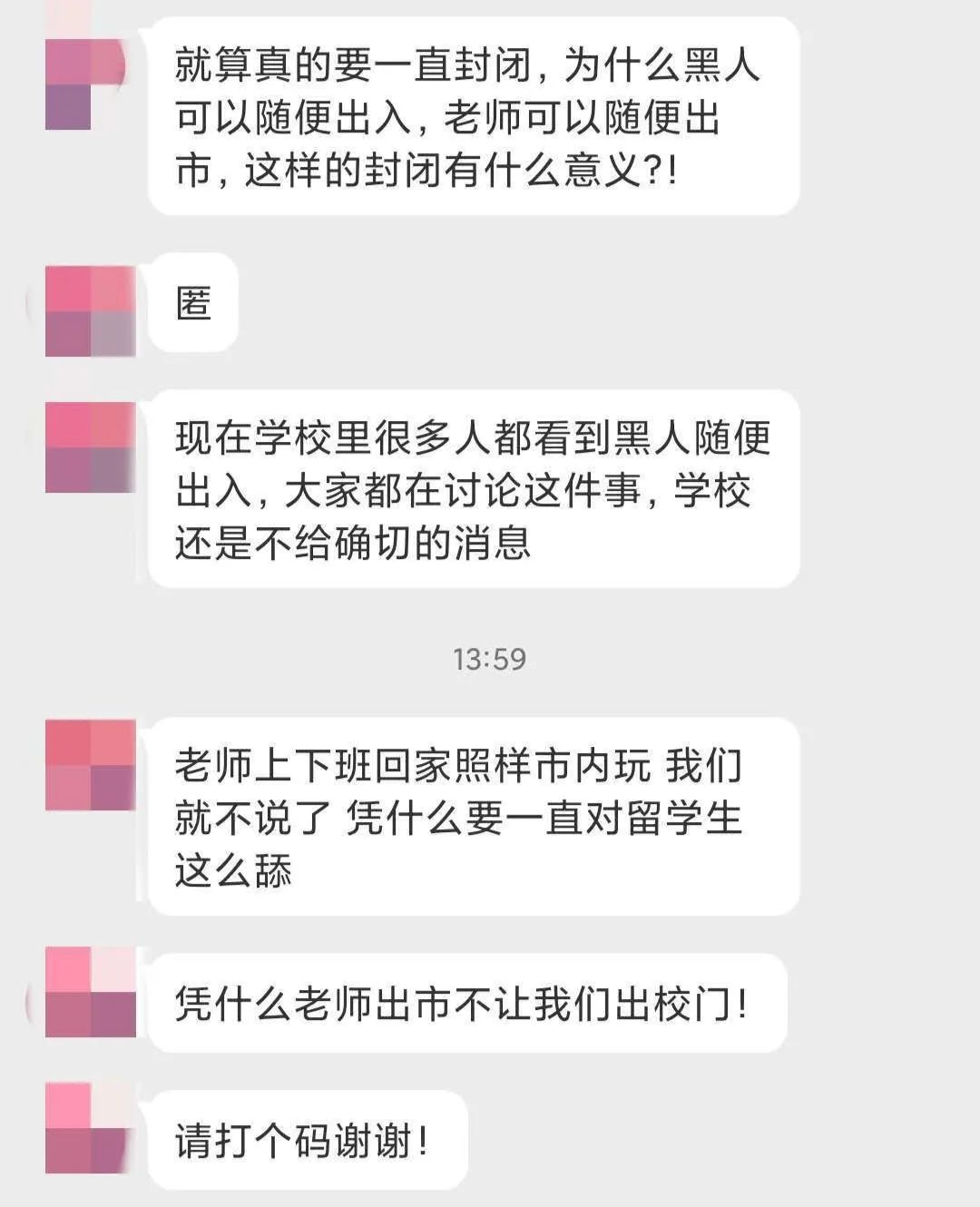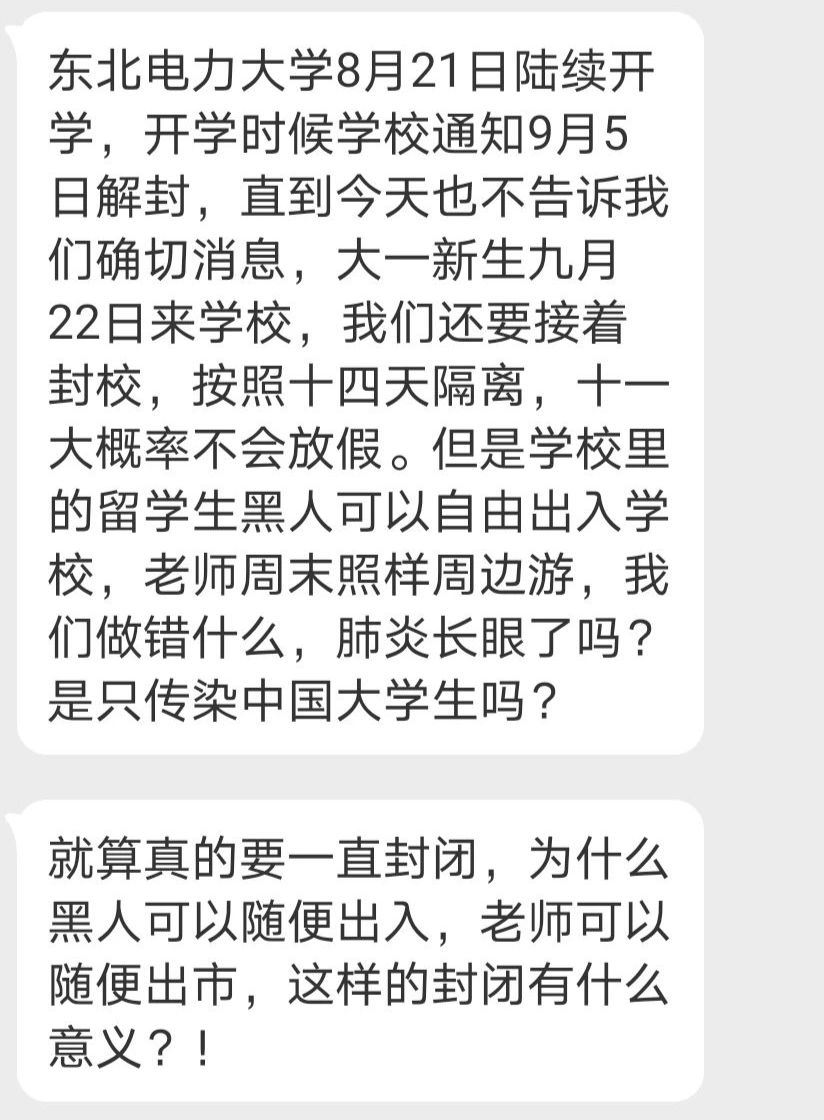 同时,还有东北电力大学疫情封校管控,但黑人留学生却可以自由出入校门的情况也引发了校内学生的广泛抗议