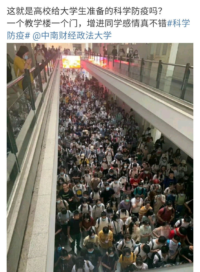 比如中南财经政法大学或许是为了便于检测的原因, 有学生称一个教学楼只开一个门,导致下课时出现大量拥堵