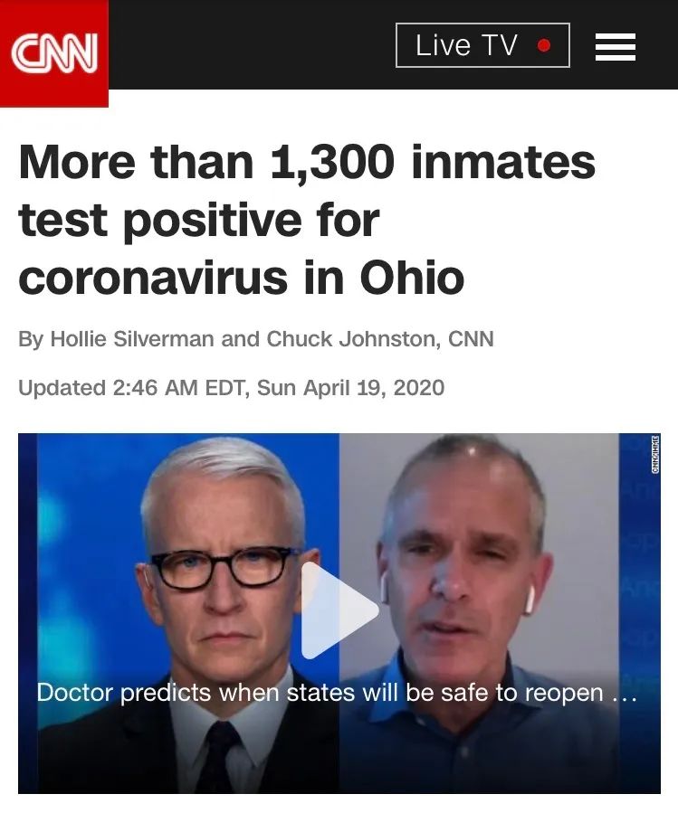 俄亥俄州的两所监狱和一所在押人员医疗中心出现聚集性感染,共计1300多名在押囚犯新冠病毒检测呈阳性,其中4人死亡。