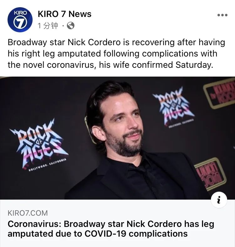 百老汇明星尼克·科德罗的妻子周六证实,尼克因感染新型冠状病毒而导致右腿截肢,目前正在洛杉矶的Cedars-Sinai医疗中心康复中。