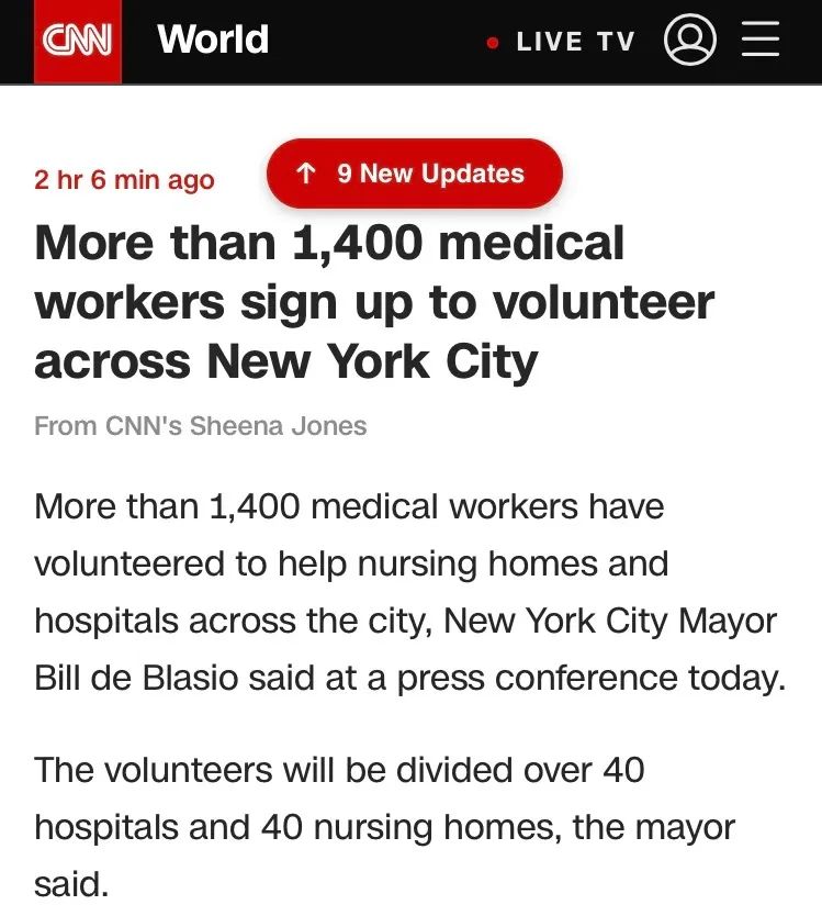 纽约市市长今天在新闻发布会上表示,已有1400多名医务工作者,志愿帮助纽约市各地的养老院和医院。市长说,这些志愿者将被分配到40家医院和40家养老院。