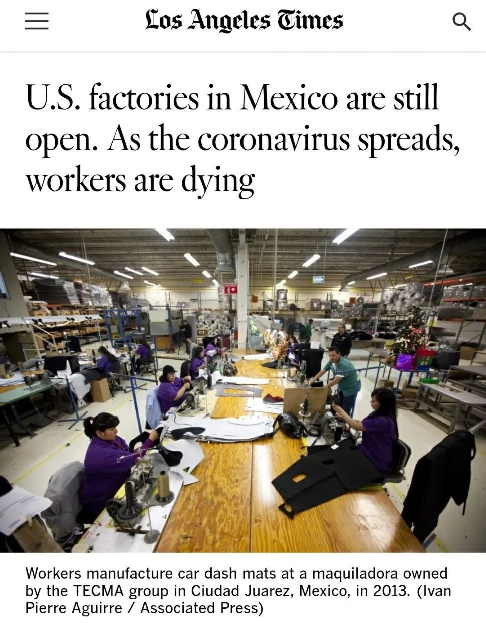 洛杉矶时报报道了在位于墨西哥的美国工厂,那里的工人在出现症状后被告知危险不大,开了药后继续上班,而其中一家工厂至少有13名员工感染去世。