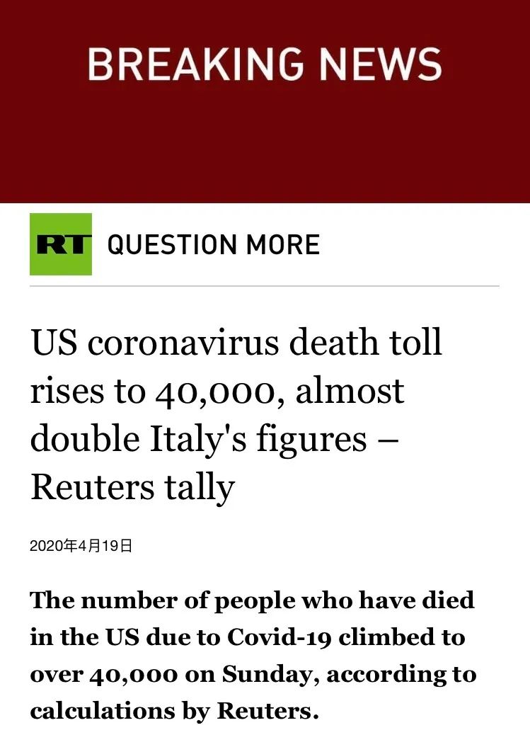 路透社报道,美国冠状病毒死亡人数上升至4万人,几乎是意大利的两倍。