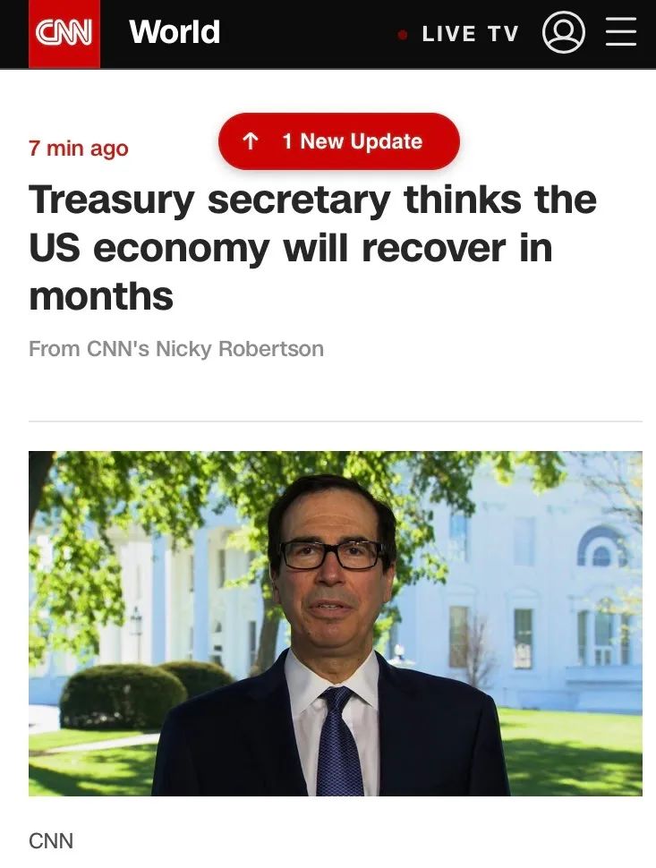 美国财政部长Steven Mnuchin告诉CNN,他认为美国经济从冠状病毒的影响中复苏只需要几个月,而不是几年。一旦经济重新开放,他相信将会出现“大幅反弹”。