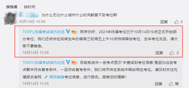 虽然很多人表示,自己阵亡在了第1关“抢考位”上,但托福也已经在微博上进行回复,会在后续全年的每周三和周五上午10点持续释放考位,保证全年考位充足。