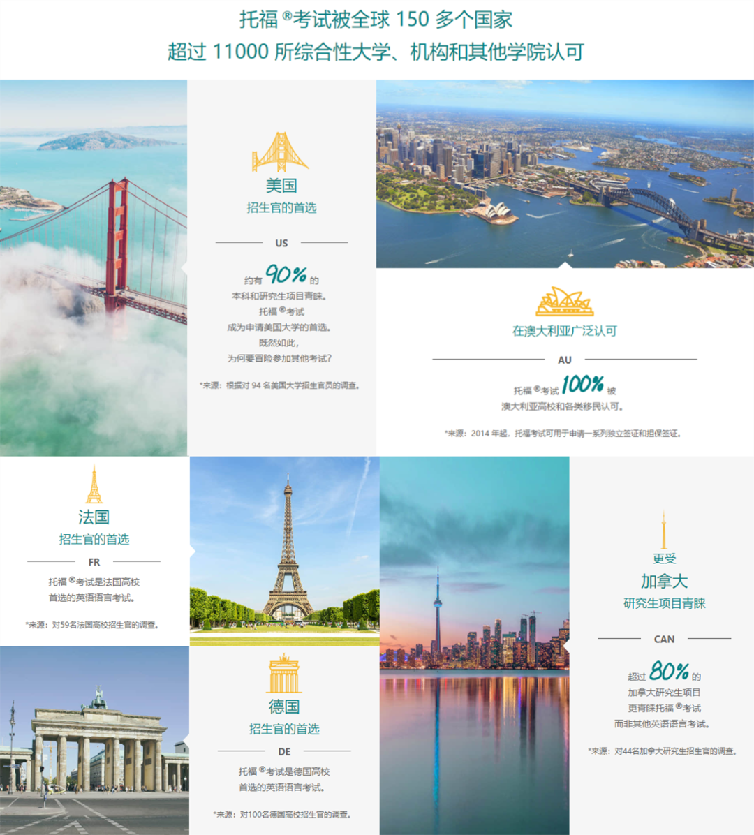 另外,全球150多个国家都接受托福成绩申请,涵盖了包括北美、英联邦、欧洲、亚洲等地区在内的11,000多所院校。比如: