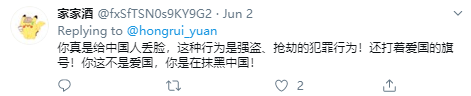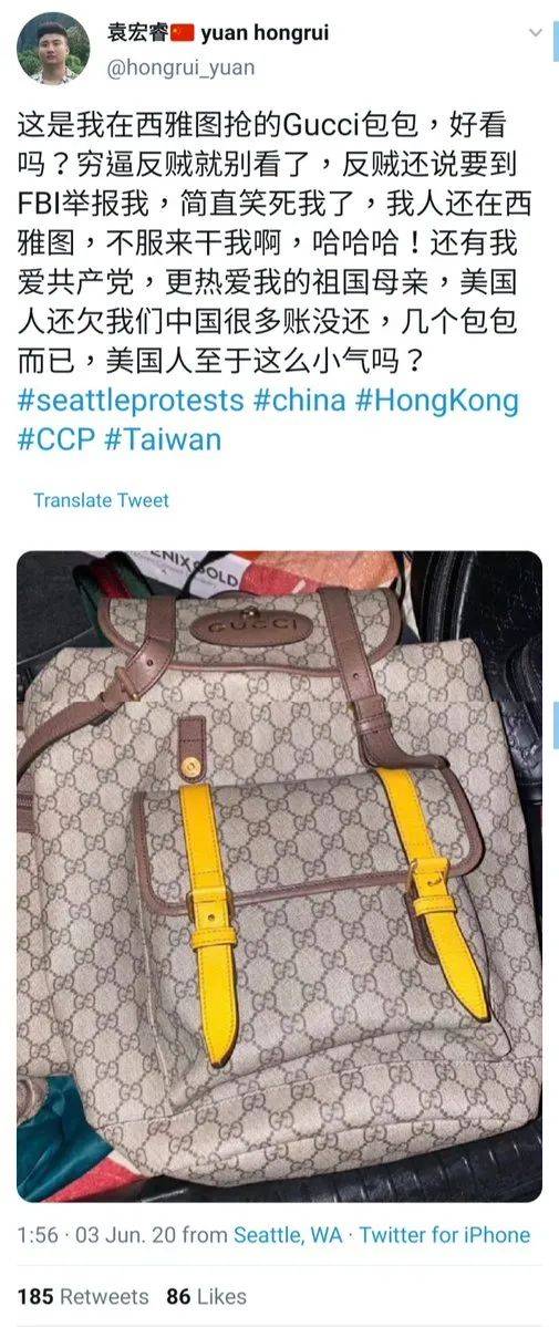 6月3日,一名疑似中国留学生的@袁宏睿,在推特上po出自己抢来的多个"战利品",呛声说:“你们穷人买不起 。”