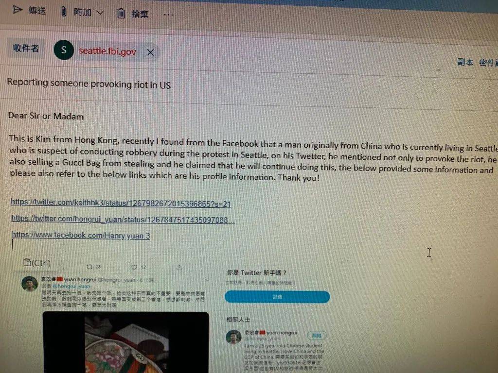 “袁宏睿”的推特账号被网友疯狂举报,还有人愤怒到直接写举报信发给FBI西雅图分部,并附上了他的多条推特链接。