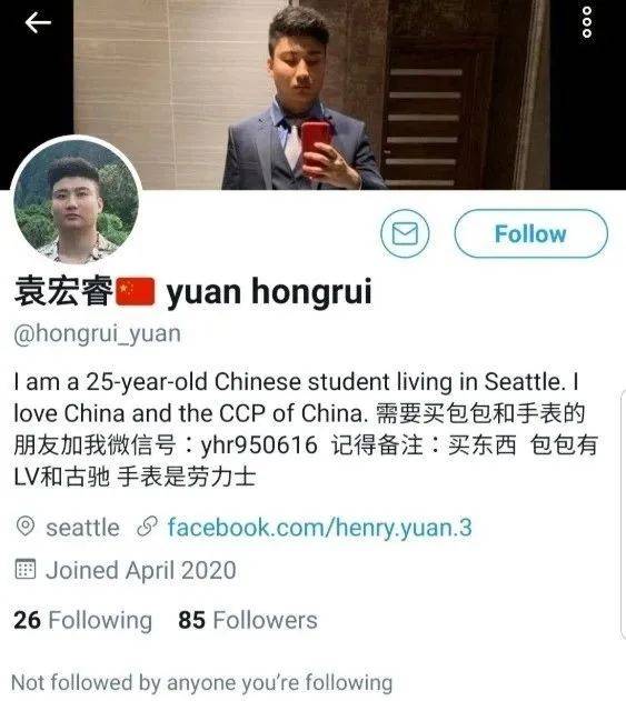 天朝网友扒出,这位袁宏睿今年25岁,目前在美国西雅图求学,确确实实是名留学生。