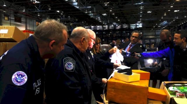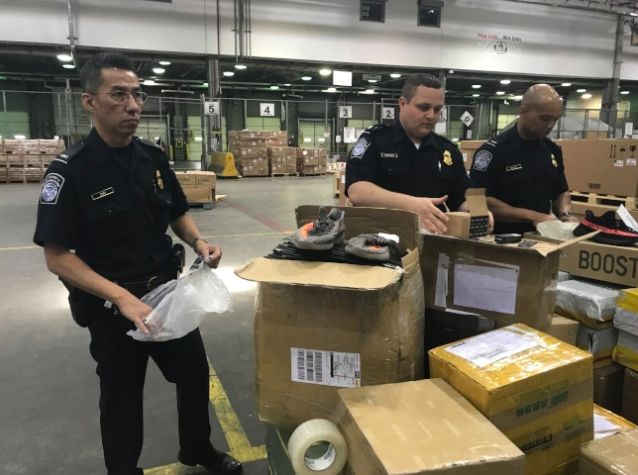 CBP执法人员开箱检查仿冒品,以价格、质量等验证是否为仿冒品。