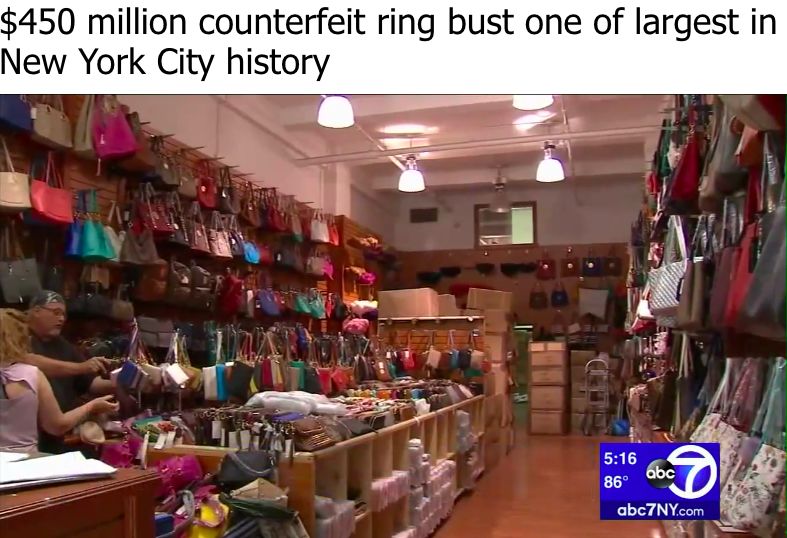 2018年8月,美国警察破获过一起4.5亿美元超大走私案,当时22名纽约华人被捕,当局称这是纽约历史上最大型的假冒商品打假行动。
