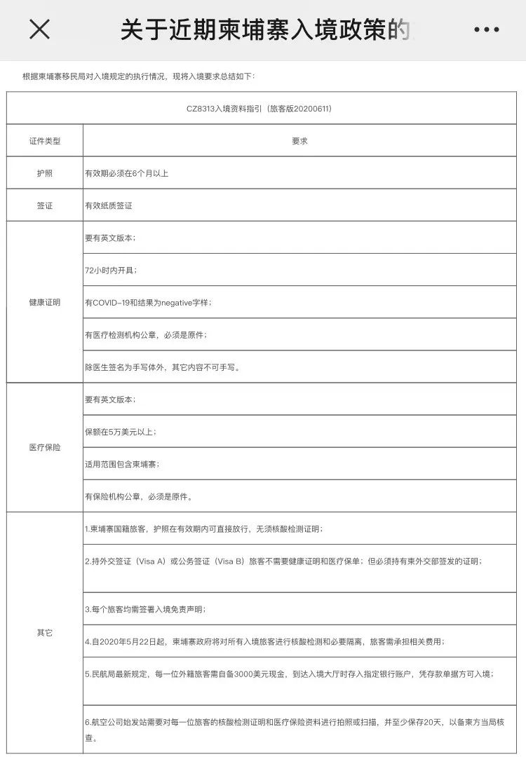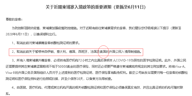 6月13日,中国南方航空更新一则《关于近期柬埔寨入境政策的重要通知(更新至6月11日)》的通知,明确表示取消此前关于暂停来自伊朗、意大利、德国、西班牙、法国及美国的外国公民入境限制措施