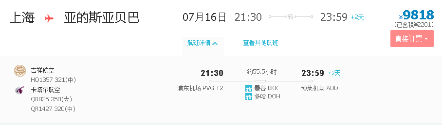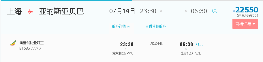 前往埃塞尔比亚机票:上海飞埃塞首都亚的斯亚贝巴。