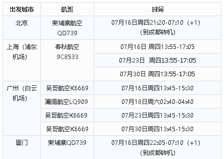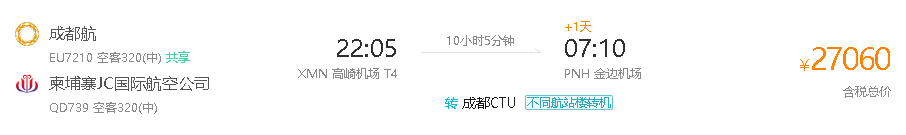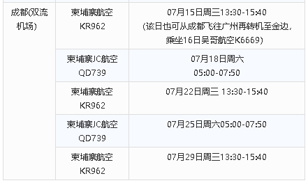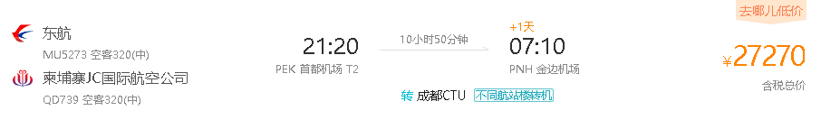 目前有从国内去往柬埔寨(金边)机票所在城市包括:北京、上海、广州、厦门、成都。