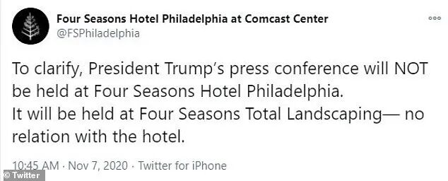 11月7日,特朗普发推表示要在费城的四季举行大记者会。