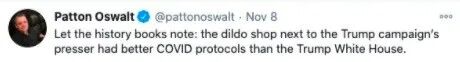 但总之,最后的结果就是真的在这个离奇的地方开了记者会。脱口秀喜剧演员Patton Oswalt 甚至发了条推嘲讽说:“以后的历史书应该加个注解:川普竞选团队记者会隔壁成人用品店的新冠防护措施都做得比白宫要好。”