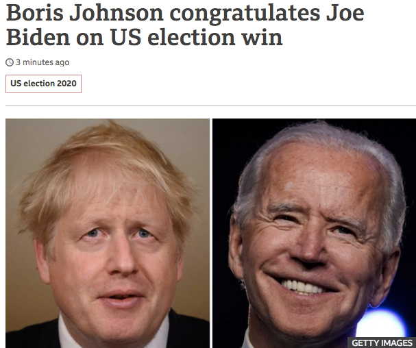 就连之前紧随特朗普、跟拜登都不太熟(连张同框的相片都找不出来)的英国首相鲍里斯·约翰逊(Boris Johnson)都在第一时间发推向拜登表示祝贺。