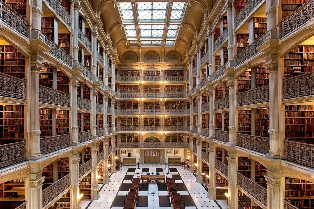 George Peabody图书馆,位于巴尔的摩约翰霍普金斯大学Peabody校园,拥有超过30万本藏书,6层楼,通透的大堂。