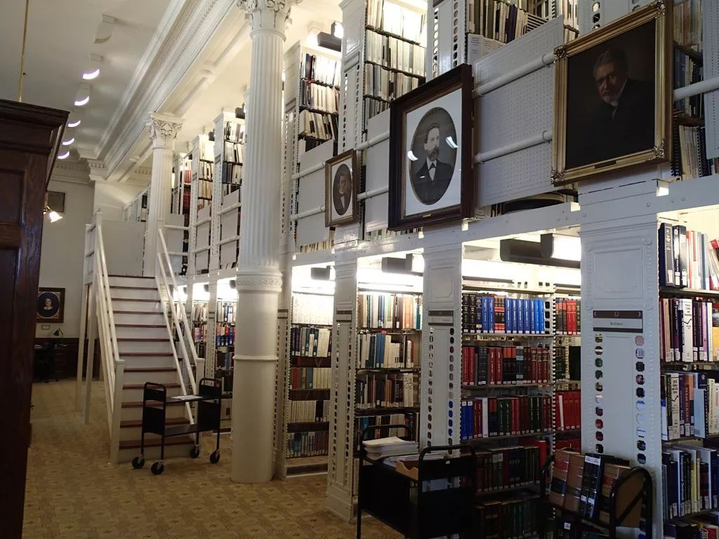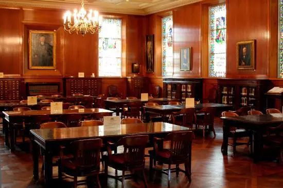 该图书馆外覆盖着天主教堂风格的砂岩和砖石,内部有两层圆形的阅览室,华丽的台阶,精美的木质装饰。