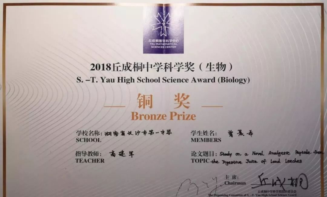 荣获丘成桐中学科学奖全球总决赛铜奖