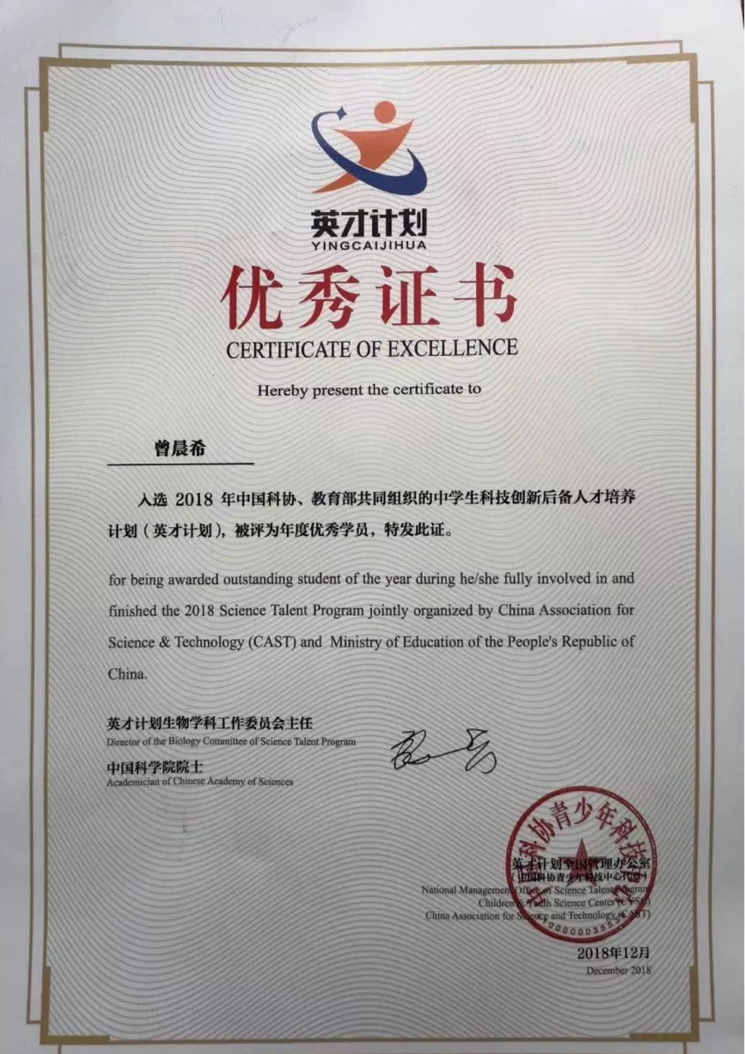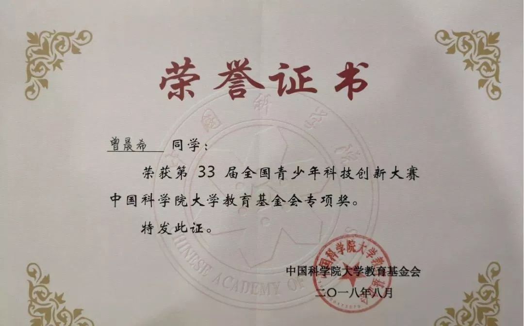 在校期间,曾晨希多次获得“校长特别奖”、“三好学生”、“优秀学生干部”等荣誉称号。