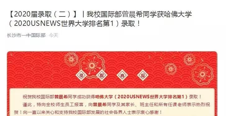 据统计,今年中国籍学生共有5人被录取,其中海外高中学生4人,而来自长沙一中的曾晨希,则是今年国内高中2019年哈佛大学本科早申录取唯一1人。