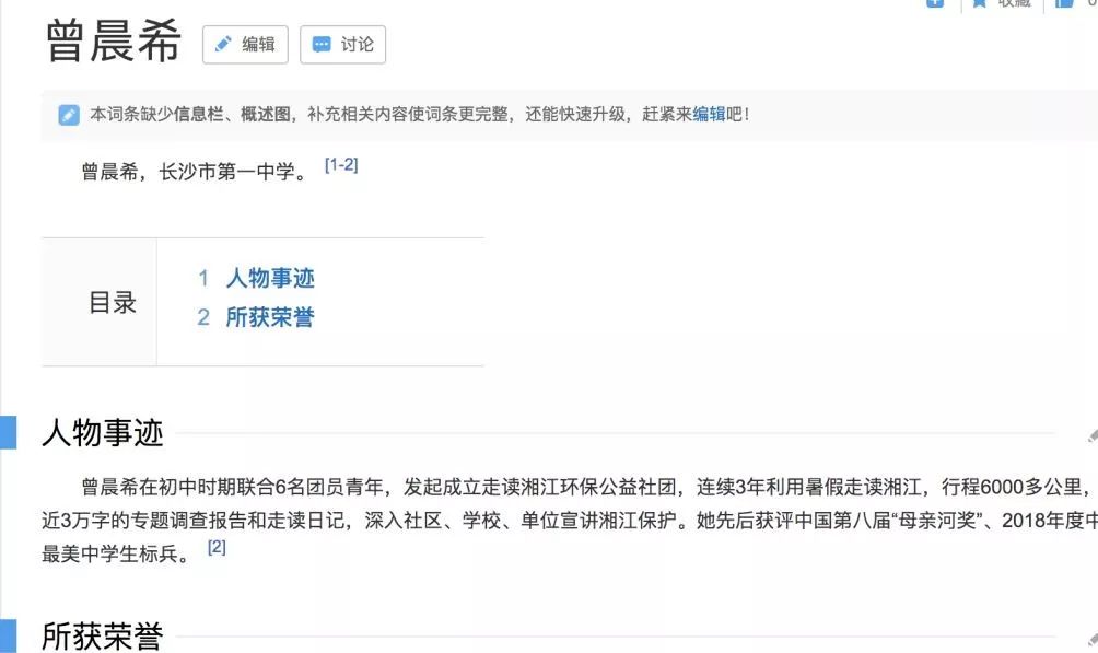 高二那年,曾晨希被评为:2018“湖南江河卫士”,还被写入了湖南省中学地理教材。而后,她两次获邀参加亚太低碳技术峰会,并在会上做英文主题演讲。
