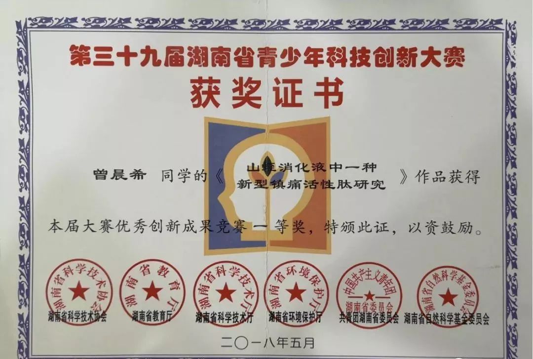 荣获第39届湖南省青少年科技创新大赛一等奖