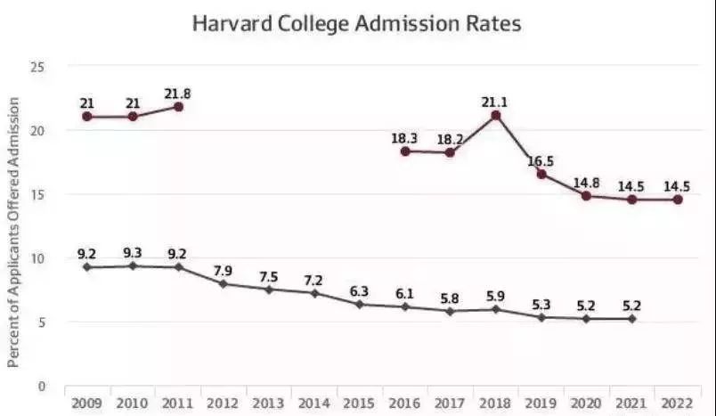 根据哈佛相关图示,哈佛早申录取率自2018年后一直在下降。