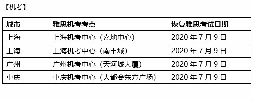 ·7月9日起在上海、广州、重庆3所机考中心共4个考场恢复雅思和用于英国签证及移民的雅思(IELTS for UKVI)机考。
