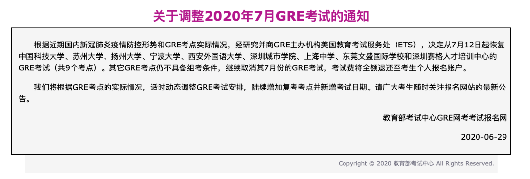 鉴于部分国内GRE考点已具备恢复考试的条件,美国教育考试服务中心(ETS)与教育部考试中心(NEEA)共同商讨决定从7月12日起恢复以下考点的GRE®普通考试: