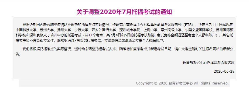 根据教育部当前针对新型冠状病毒感染肺炎疫情防控的相关要求,其它考点暂不具备组考条件,ETS与教育部考试中心决定自即日起取消这些考点7月份的所有托福iBT考试和GRE®普通考试。