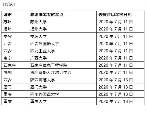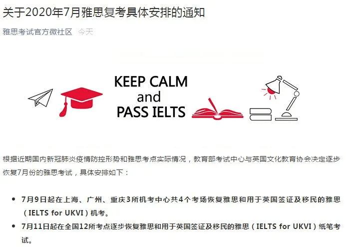 ·7月11日起在全国12所考点逐步恢复雅思和用于英国签证及移民的雅思(IELTS for UKVI)纸笔考试。