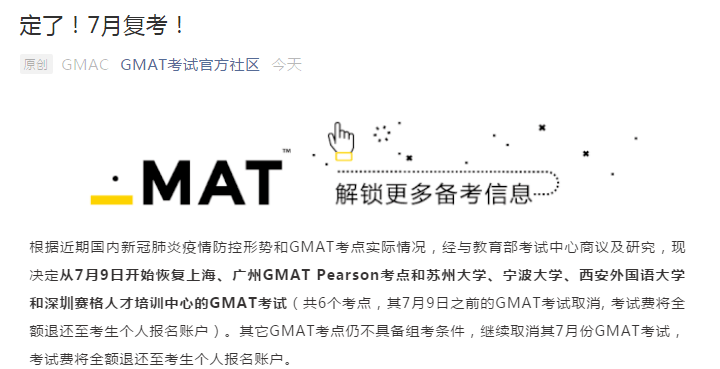 从7月9日开始恢复上海、广州GMAT Pearson考点和苏州大学、宁波大学、西安外国语大学和深圳赛格人才培训中心的GMAT考试(共6个考点,其7月9日之前的GMAT考试取消, 考试费将全额退还至考生个人报名账户)。