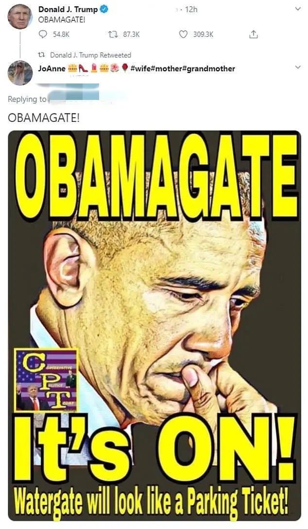 不仅大骂奥巴马是“第一个发表反对继任者言论的前总统”,而且还用美国总统最大丑闻的水门事件来比喻,造了一个“奥巴马门(ObamaGate)”