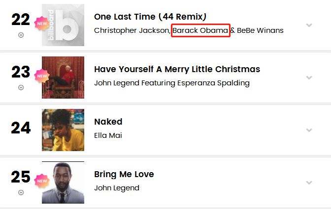 2019年1月,奥巴马居然登上了公告牌R&B热门歌曲榜单,而且演唱的曲目在1月5日的排行榜中位居第22名!