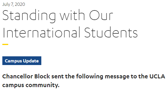 UCLA也不甘落后,在三校联合起诉后几个小时内,也迅速发表声明:坚决和国际学生站在一起!
