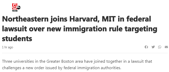 当天晚些时候,东北大学也紧随其后,表示东北大学将与哈佛大学和麻省理工学院一起提起诉讼,为国际学生争取应有的权益。