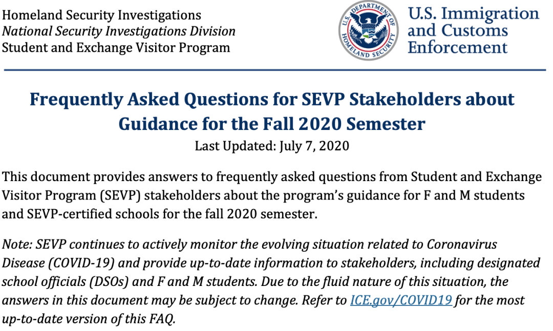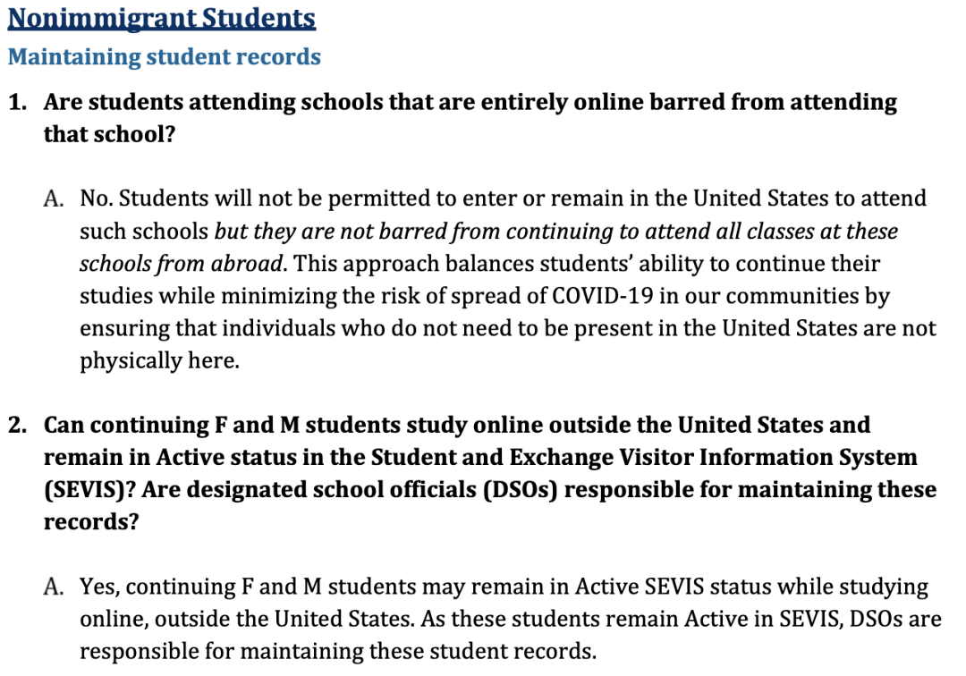 这份文件证实了之前“学校如果采取全网课模式,则非移民国际学生必须从美国境内离开进行远程上课”的条例,但是同样给了留学生们一丝希望: