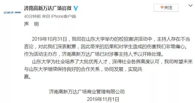 11月1日,济南高新万达广场商业管理有限公司官方发布声明,对主持人的不当言论深表歉意,并且表示,作为活动主办方,济南高新万达广场已对涉事主持人予以开除处理。