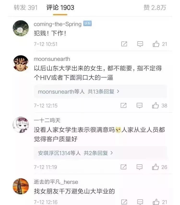 “你女朋友/老婆是山东大学的”成为一种骂人的新句式,类似的侮辱性话语在网络上随处可见。