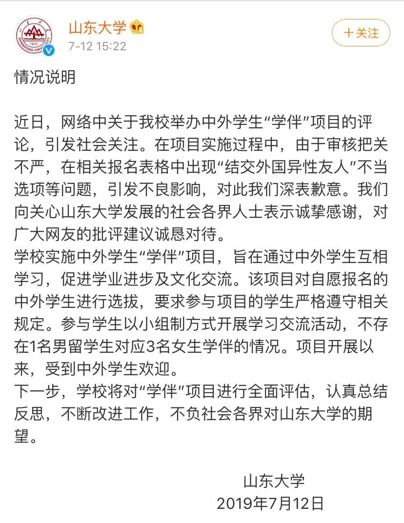 2019年7月12日,山东大学官微发表了一条声明,对“学伴”事件进行道歉,称山东大学将对“学伴”项目进行全面评估,认真总结反思,不断改进工作,不负社会各界对山东大学的期望。