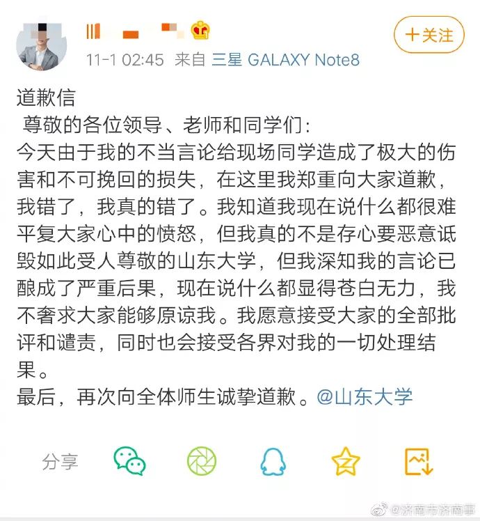 11月1日,该主持人凌晨两点多对此发致歉信,称自己不是存心要恶意诋毁山大和山大的同学,请求大家的原谅。