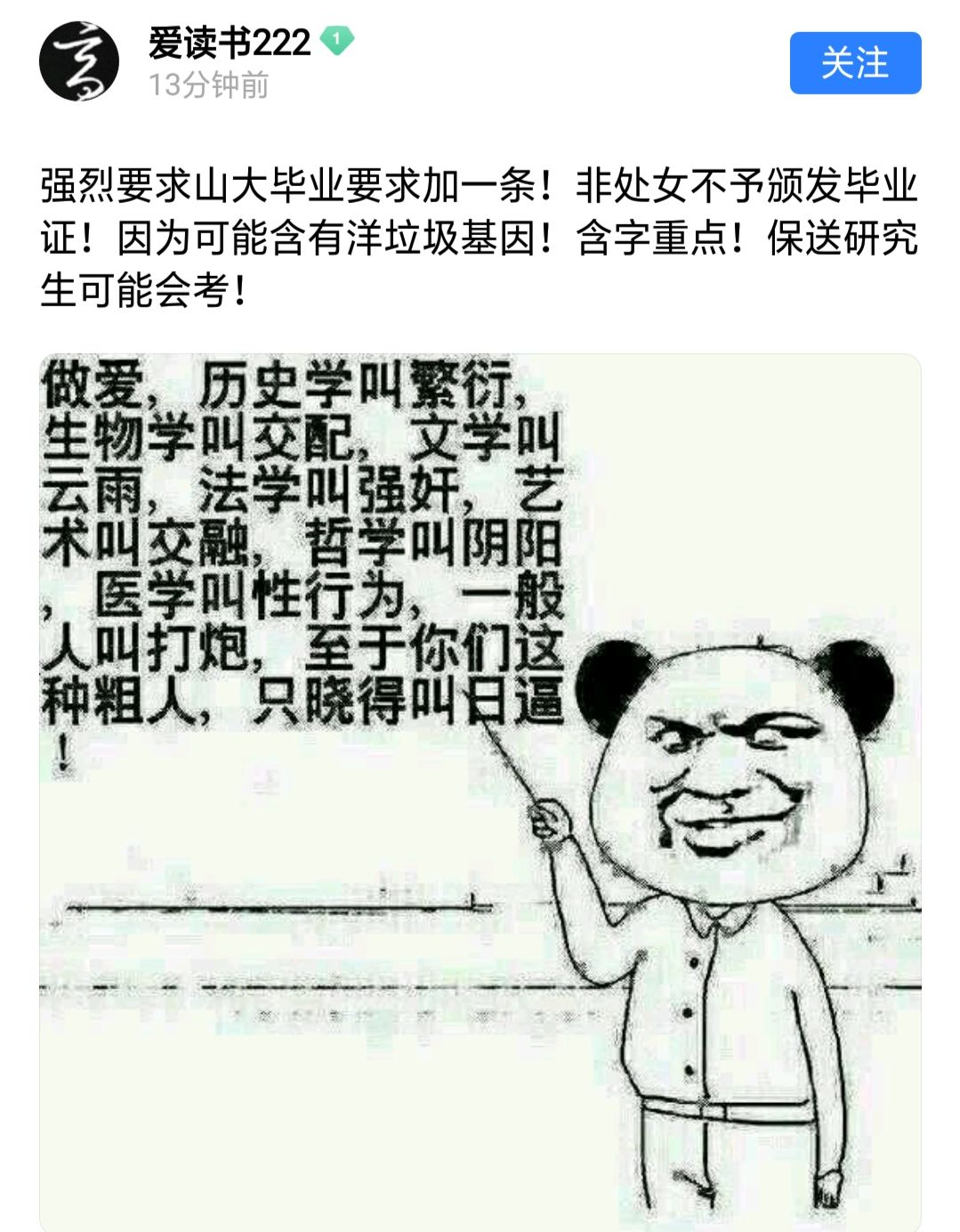 一群人高举着不让中国女生被留学生欺负的大旗,却逐渐演变成对山大女生进行荡妇羞辱的狂欢,实在令人作呕。