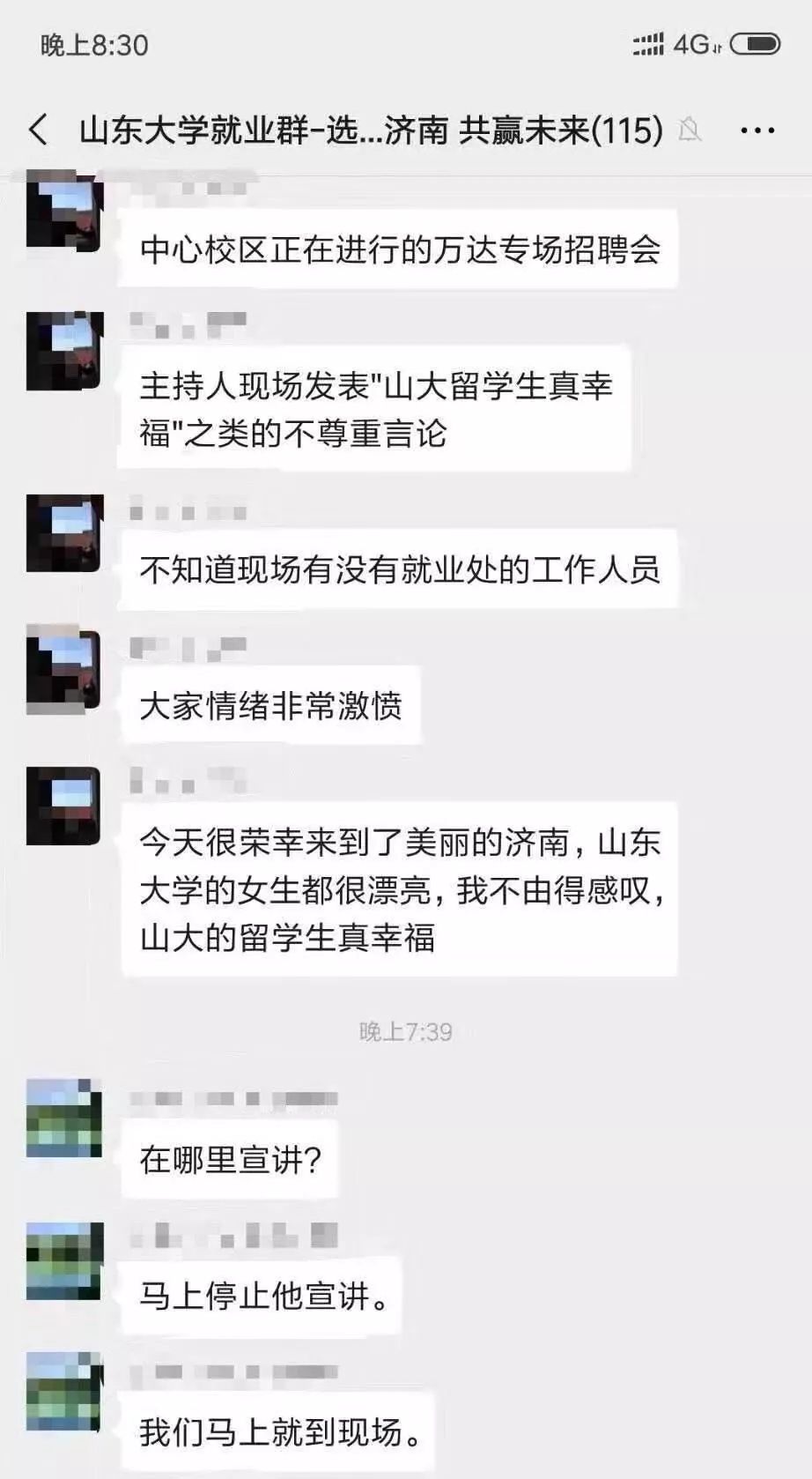 事情发生后,现场学生群情激愤,并且立刻向山大就业中心说明情况,就业中心负责人得知情况后,迅速达到现场叫停了宣讲会,并要求万达主持人道歉,不然就报警处理。