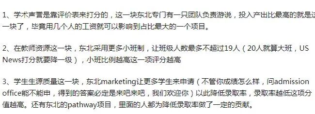 美国的东北大学(Northeastern. University),就是高等教育领域领域著名的刷排名大师。US News美国大学排名的算法和国际排名不同,本科学术声誉(22.5%),教师资源(20%),学生生源质量(12.5%)这几项的比重特别大,加起来已经超过了50%。于是东北大学的高层做了个评估,发现这几项数据有刷榜的空间,就成立了专门的团队去运作这件事——
