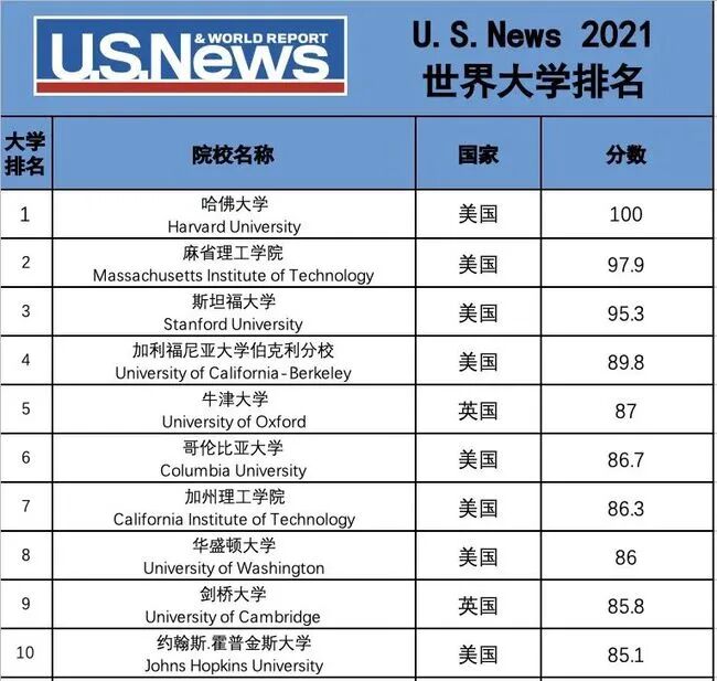 在今年的大学综合榜单里,前五名和去年相比没有太大变化,仍然是美国四所和英国一所。